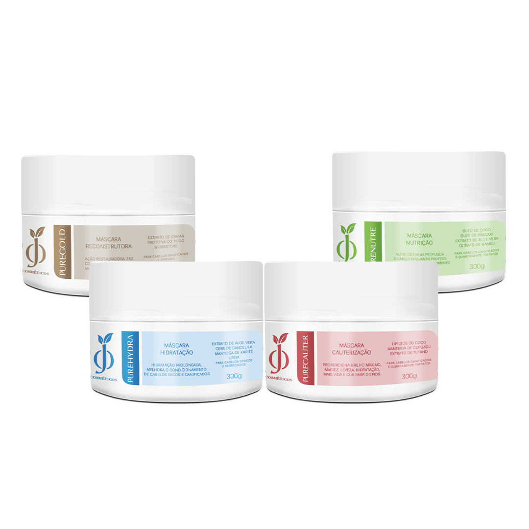 Experimente o incrível Kit Máscaras PureGold + PureHydra + PureCauter + PureNutre da OJ Cosméticos. Este kit exclusivo oferece uma combinação poderosa de máscaras capilares de alta qualidade para cuidar dos seus cabelos de forma completa.