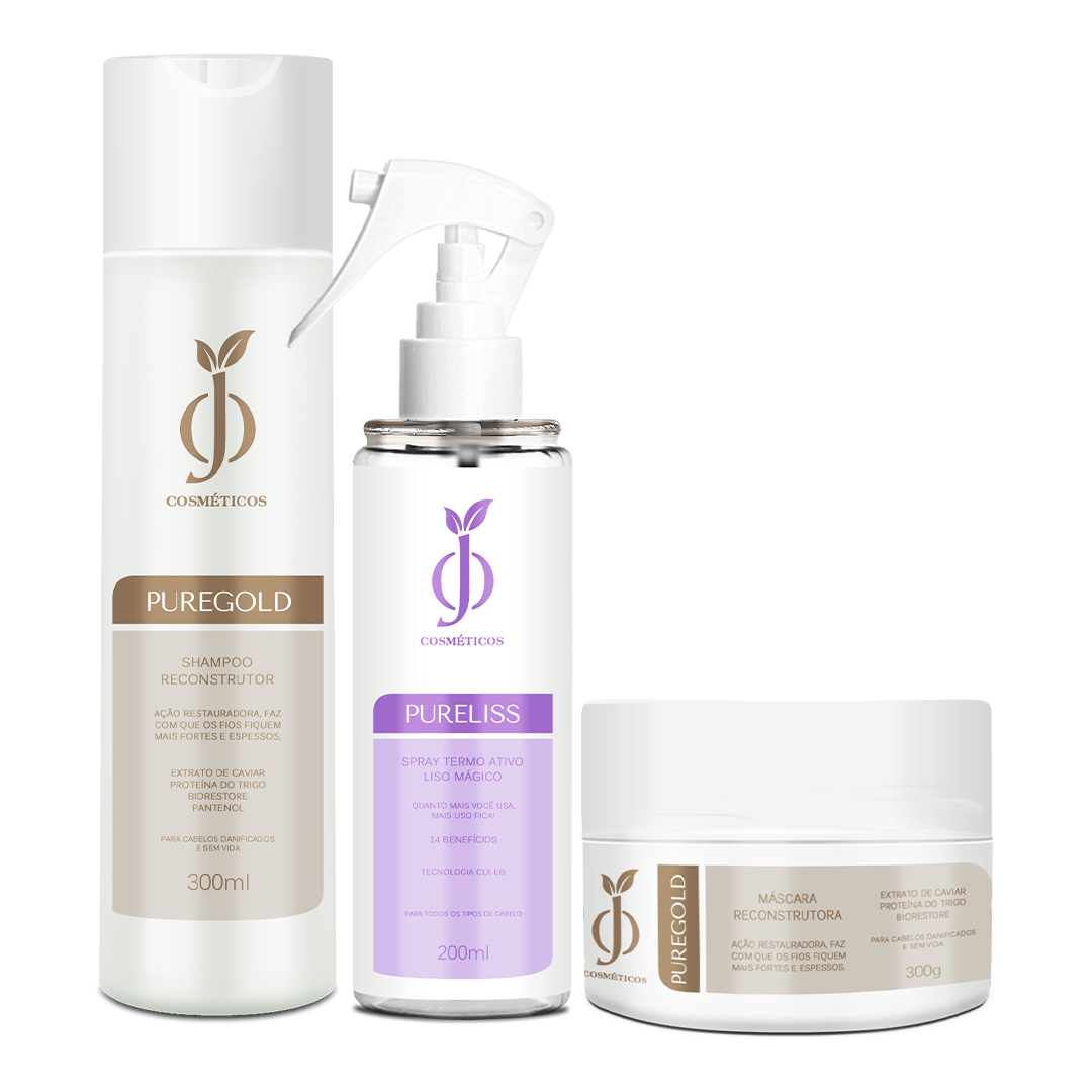 Com o uso regular do Kit PureGold, seus cabelos ficarão visivelmente mais nutridos, fortalecidos, brilhantes e lisos. O efeito liso do Spray PureLiss durará por mais tempo, e os fios ficarão macios, sedosos e livres de frizz. Você terá cabelos deslumbrantes e dignos de salão de beleza.